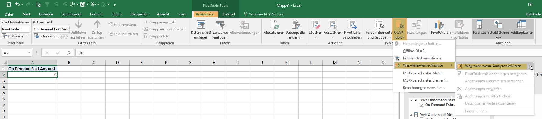 Im Excel unter PivotTable-Tools > Analysieren > Berechnungen > OLAP-Tools > Was wäre-wenn-Analyse > Was wäre-wenn-Analyse aktivieren: