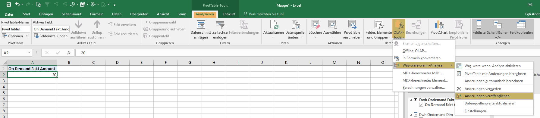 Im Excel unter PivotTable-Tools > Analysieren > Berechnungen > OLAP-Tools > Was wäre-wenn-Analyse > Änderungen veröffentlichen:
