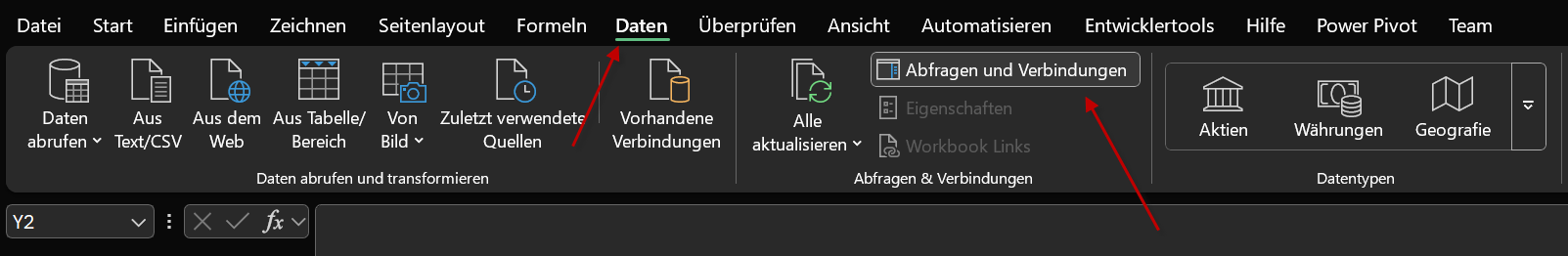 Um den Server- oder den Cube Namen anzupassen, muss das Excel geöffnet und ins Register Daten gewechselt werden. Im Register Daten gibt es eine Funktion mit der Bezeichnung Abfragen und Verbindungen.