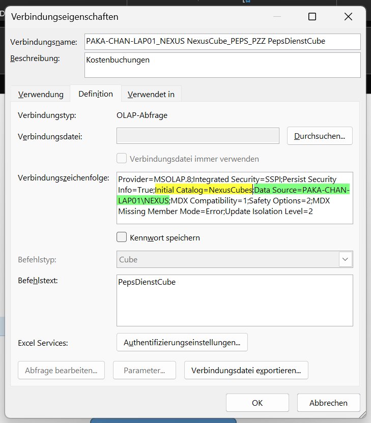 - Initial Catalog (Gelb): Hier wird der Name des Cubes eingetragen. Wenn sich dieser nicht ändert, muss nichts gemacht werden.
