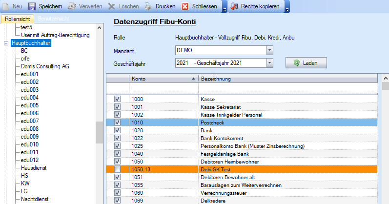Auswertungen | In Auswertungen mit Ergebnisberechnungen (z.B. Bilanz, Erfolgsrechnung) wird das Konto gelistet, damit die Ergebnisse nicht verfälscht werden. In Auswertungen mit Details der Buchungen (z.B. Buchungsjournal) wird das nicht berechtigte Konto nicht ausgegeben. Das heisst der Benutzer hat keinen Zugriff auf die Kontodetails. In Auswertungen mit Konto-Selektion erscheint das nicht berechtigte Konto nicht in der Kontoauswahl. |