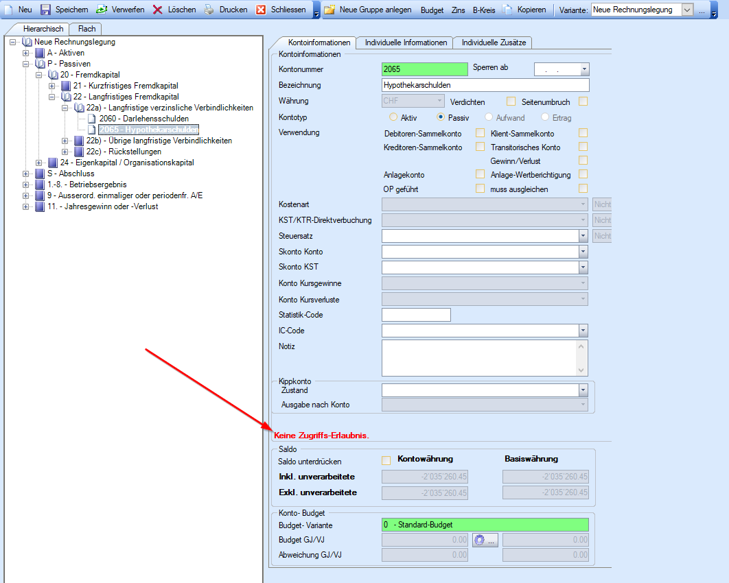 Stammdaten | Konto sichtbar aber nicht ändernbar. Beim Speichern erscheint ein roter Hinweis „Keine Zugriffserlaubniss Wichtiger Hinweis: Legt ein Benutzer ein neues Konto an, so hat er und alle anderen Benutzer automatisch Zugriff auf das Konto. Ausnahme: Wenn ein Benutzer auf gar kein Konto Zugriff hat, wird auch ein neu erfasstes Konto durch einen anderen Benutzer nicht berechtigt. |