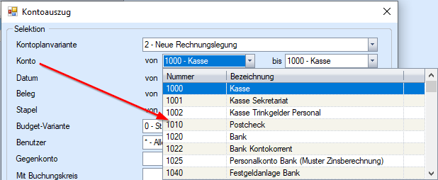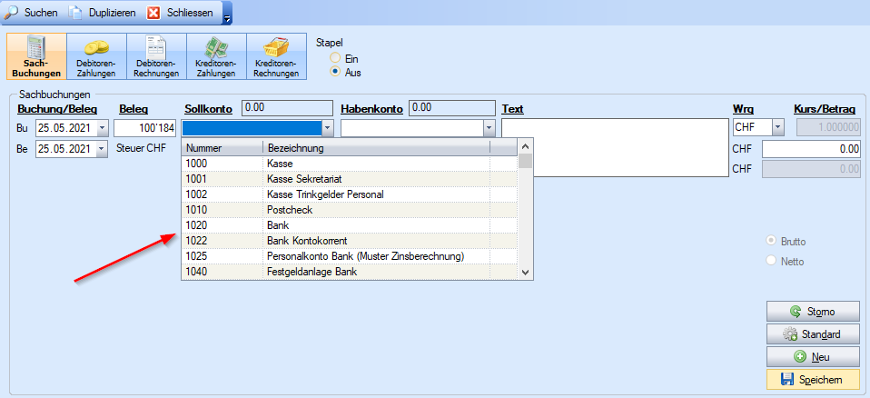Buchen | Beim Buchen erscheint das Konto nicht in der Kontoauswahl. Das heisst, der Benutzer kann auf das nicht berechtigte Konto nicht buchen. |