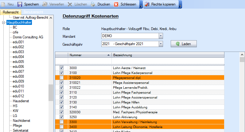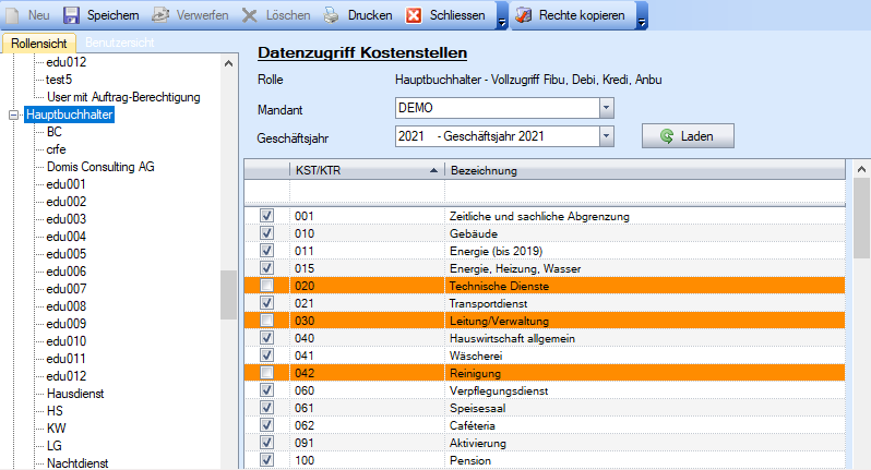 [Drucken] | Mit der Toolbar-Schaltfäche [Drucken] können die vorhandenen Datenzugriffe gedruckt werden. Es werden alle Zugriffe der Fibu-Konti, Kostenarten, Kostenstellen und optional auch Projekte ausgewertet. |