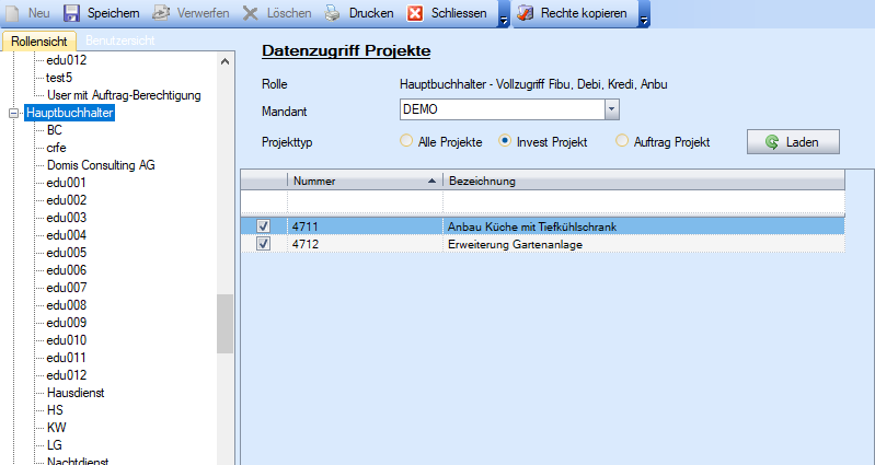 (2) Entsprechend (1): Wird ein neues Fallprojekt in den Stammdaten angelegt, dann werden die Rechte nicht auch automatisch an die bestehenden User vergeben. Im Gegensatz zu den Investionsprojekten.