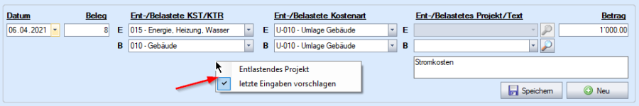 Letzte Eingaben vorschlagen | Eingeschaltet: Lässt die Eingaben beim Speichern einer Buchung für die nächste Buchung stehen |