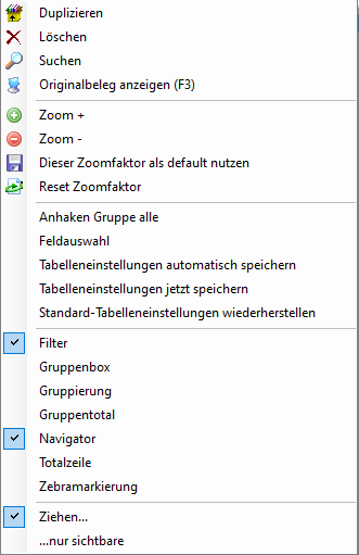 Betriebliche Leistungsbuchungen – Grid Kontextmenufunktionen
