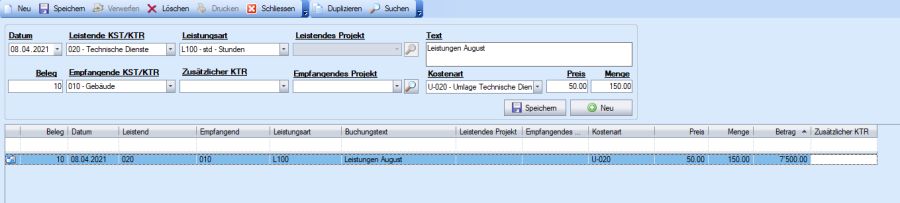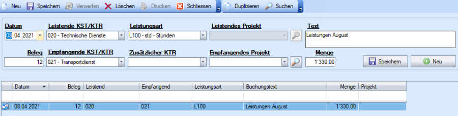 Sollen ausschliesslich Mengenwerte gebucht werden, steht die Programmfunktion Betriebliche Leistungserfassung zur Verfügung. Leistungserfassungen sind Mengenwerte, welche als Basis für die Verrechnungsschlüssel für die automatische Kostenverrechnung benutzt werden.