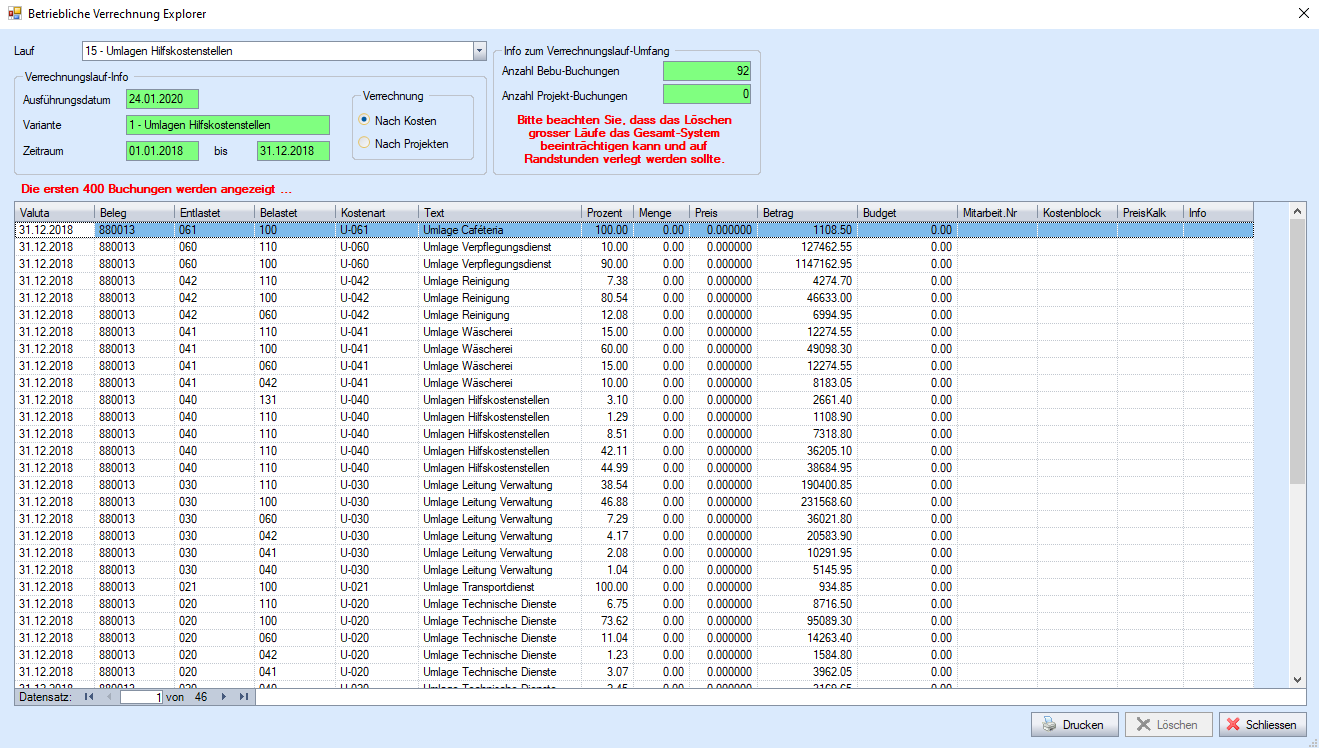 Info zum Verrechnungslauf-Umfang | Angabe der Anzahl Betriebskosten-Buchungen und der Anzahl Projektkosten-Buchungen im aktuell gewählten Lauf. | ||||||||