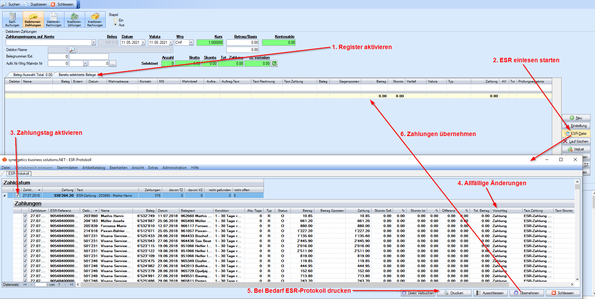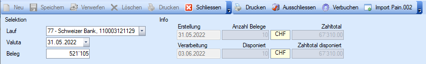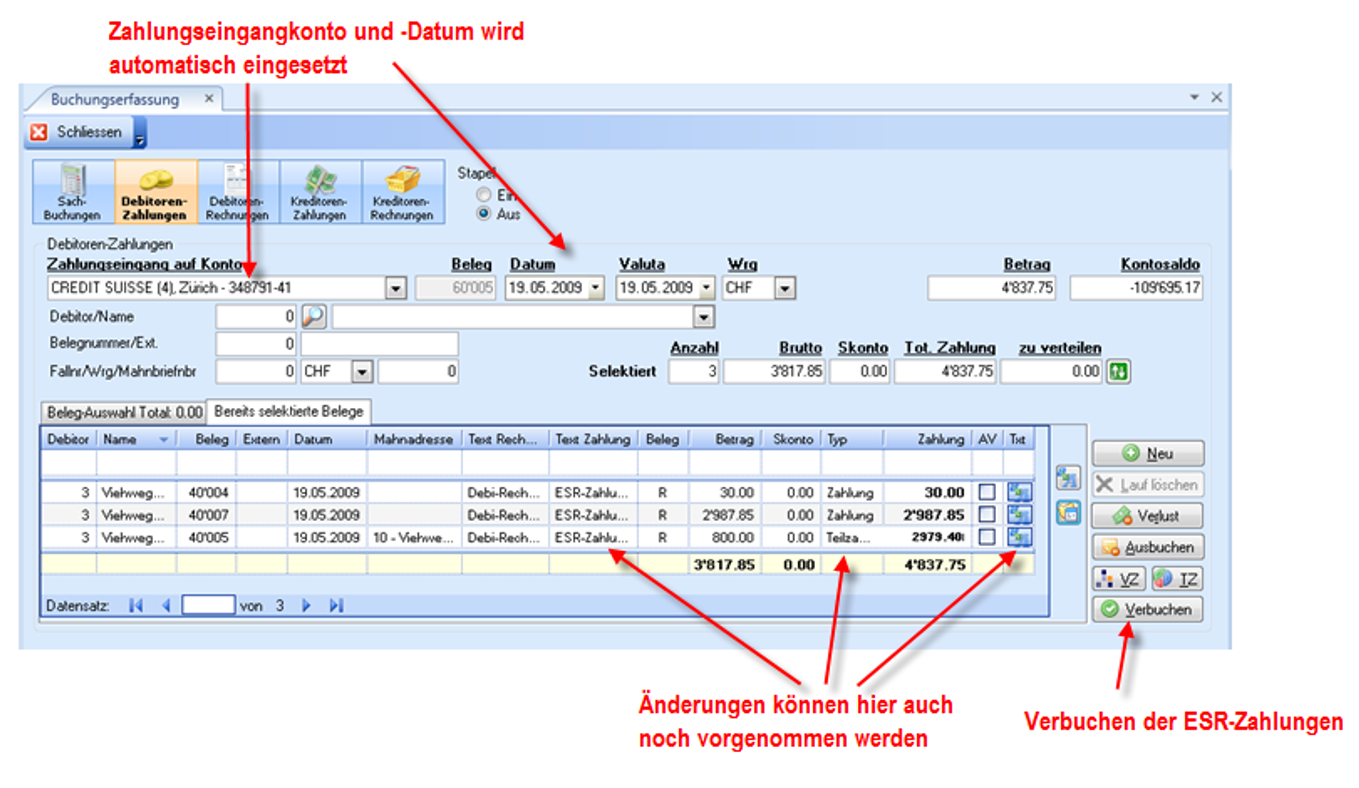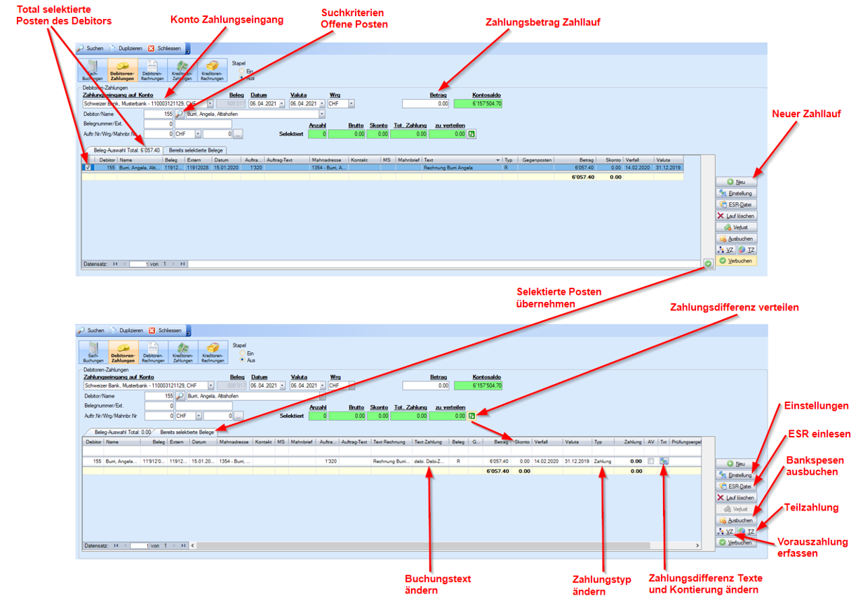 Beim Erfassungsvorgang wird zuerst mit [Neu] ein neuer Zahllauf eröffnet. Der Benutzer bestimmt in der Folge auf welche Zahlungsverbindung, zu welchem Zeitpunkt, in welcher Währung und in welcher Höhe, eine Zahlung eingegangen ist. Danach wird bestimmt, auf welche Debitoren und welche offenen Posten die Zahlung verbucht werden soll. Folgend weitere Details zur Zahlungsverbuchung: