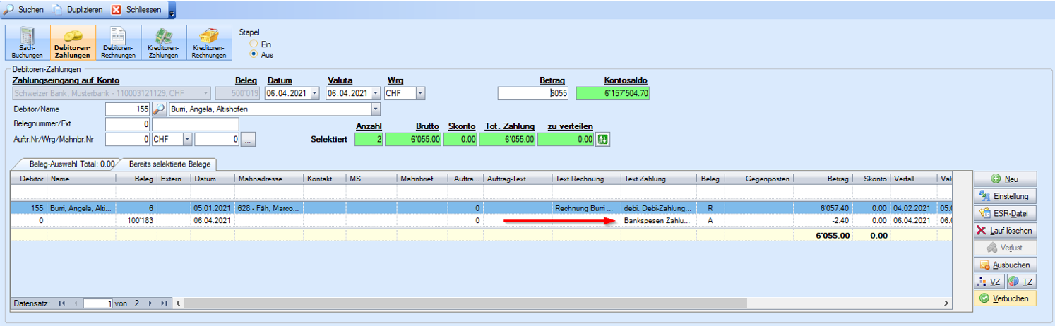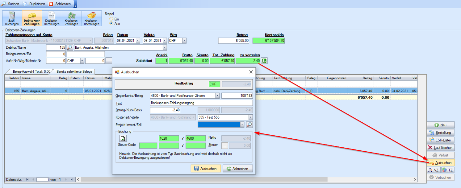 Im folgenden Fall hat der Debitor die Forderung von CHF 3‘332.30 vollumfänglich bezahlt. Die Bank belastet für die Zahlung jedoch Spesen von CHF 7.30, welche über die Funktion [Ausbuchen] ausgebucht werden kann.