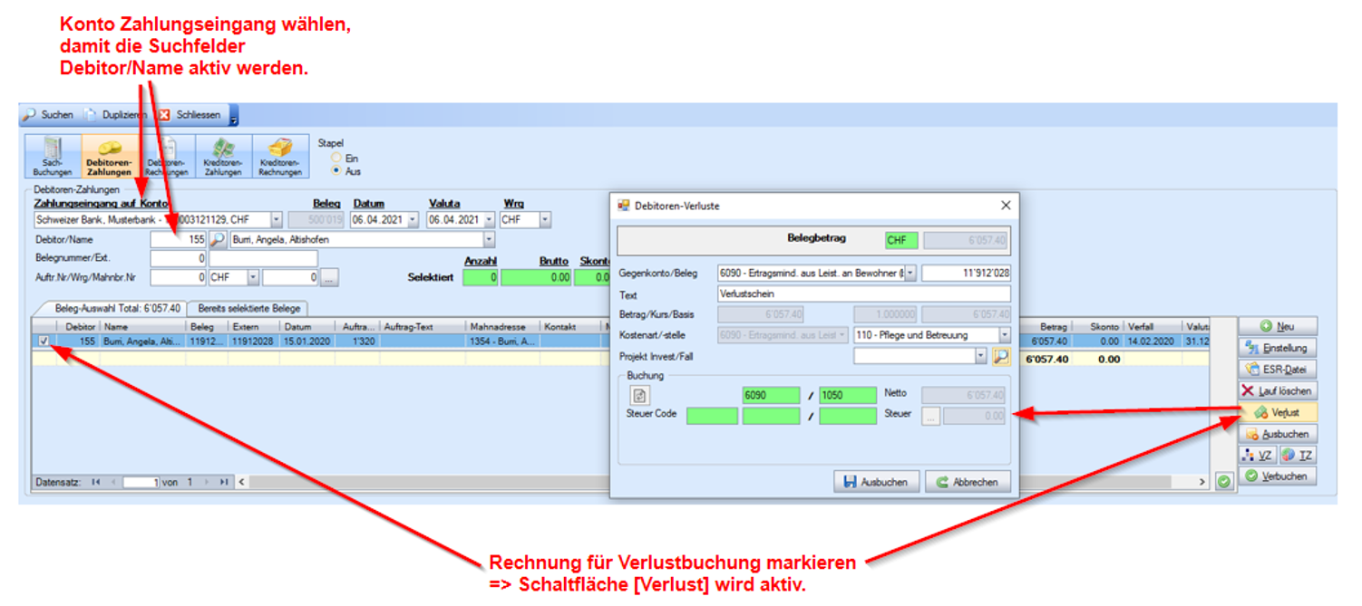 Nicht mehr einbringbare Forderungen können über die Schaltfläche [Verlust] als sogenannte Debitorenverlust ausgebucht werden. Die Schaltfläche [Verlust] wird aktiv sobald eine Rechnung in der Spalte ganz rechts aktiviert wurde. Sollen mehrere Rechnungen als Verlust ausgebucht werden, muss der Vorgang für jede Rechnung wiederholt werden. Teilverluste einer Rechnung müssen über die Zahlungsdifferenzfunktion (Skonto) ausgebucht werden.