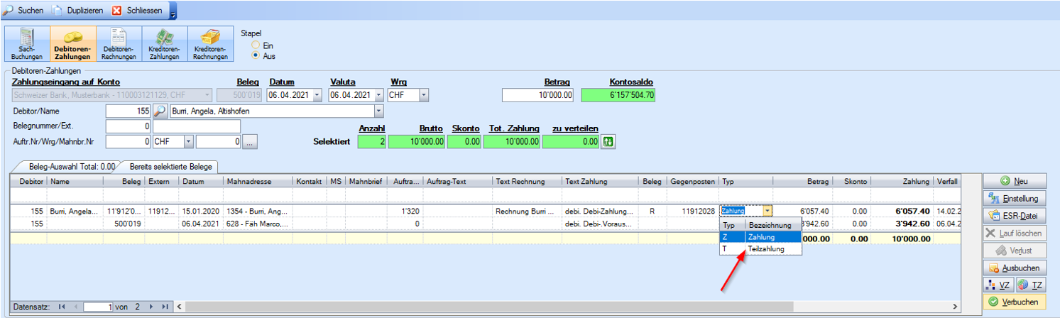 a) Typ im Grid auf Teilzahlung ändern Die Rechnung in der Belegauswahl selektieren und den Typ anschliessend im Grid auf Teilzahlung ändern.