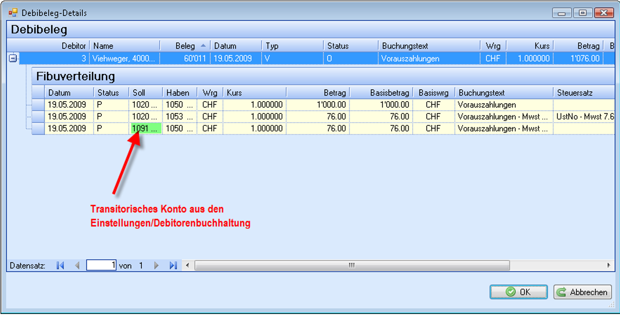 Der Steuerbetrag wird transitorisch verbucht und bei der späteren Verrechnung mit einem offenen Posten automatisch aufgelöst. Die transitorische Buchung erfolgt auf das Konto aus den Einstellungen/Debitorenbuchhaltung Feld ‚Trans.MwSt-Buchung‘.