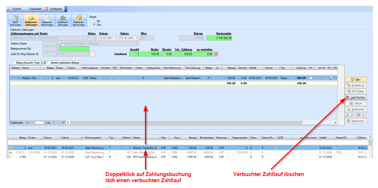 Physische Zahlungsbuchungen werden erst geschrieben, wenn [Verbuchen] ausgeführt wird. Das erlaubt eine äusserst komfortable Erfassung. Zahlungsbuchungen werden immer sofort mit Status Definitiv geschrieben. Auch die mit der Zahlung ausgezifferten Posten erhalten spätestens zu diesem Zeitpunkt den Status Definitiv und Bezahlt. Ein verbuchtes ‚Packet‘ wird als Zahlungslauf zusammengehalten.