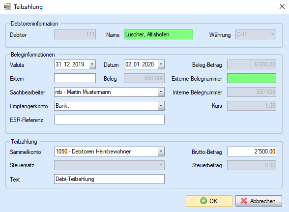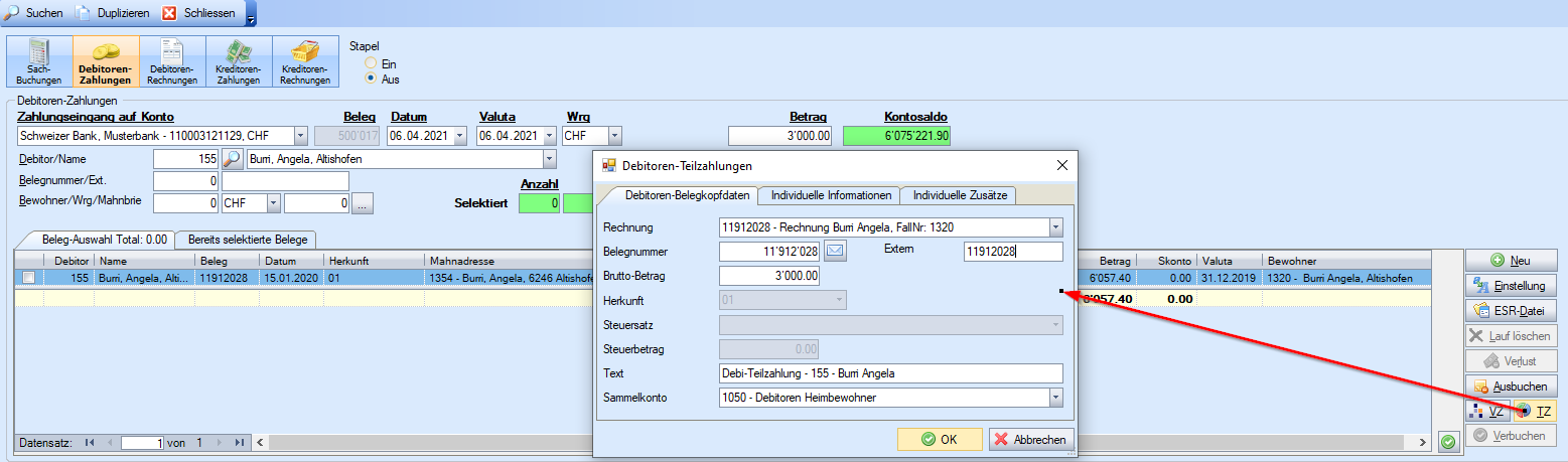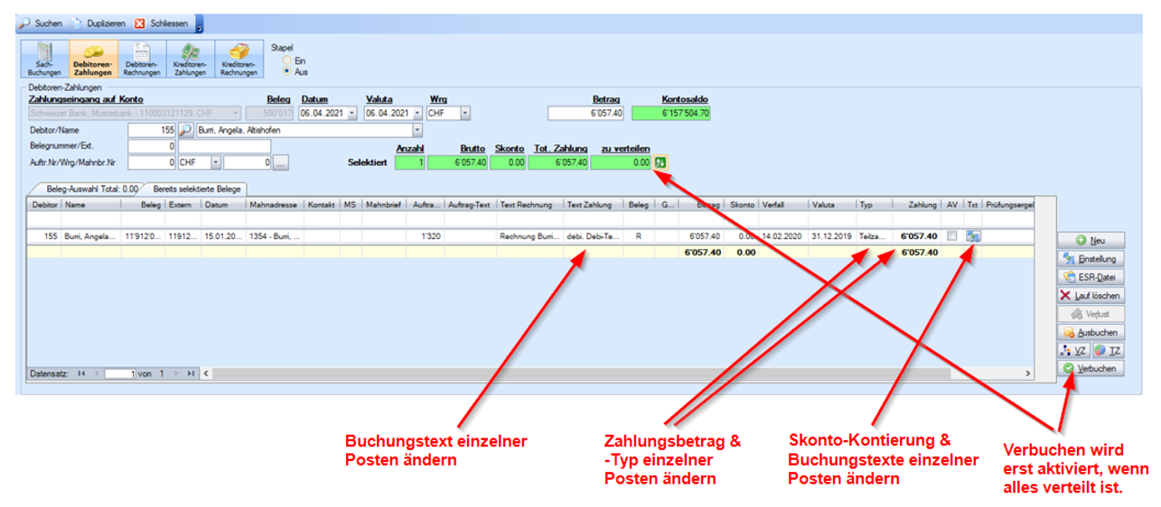 Mittels [Verbuchen] wird die Teilzahlung physisch gebucht und damit entsteht ein neuer offener Posten, welcher in einem nächsten Zahllauf z.B. anlässlich einer Restzahlung verrechnet werden kann.