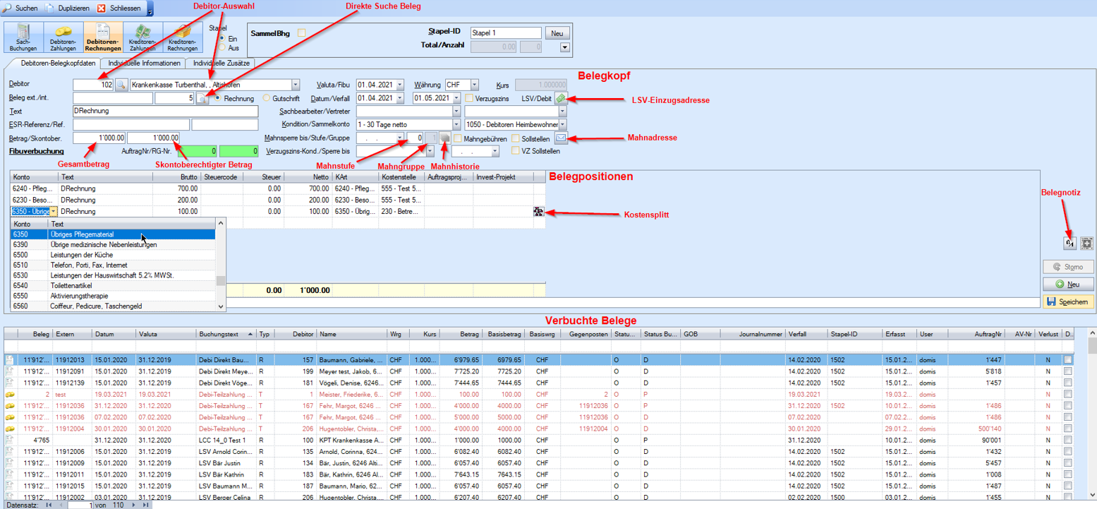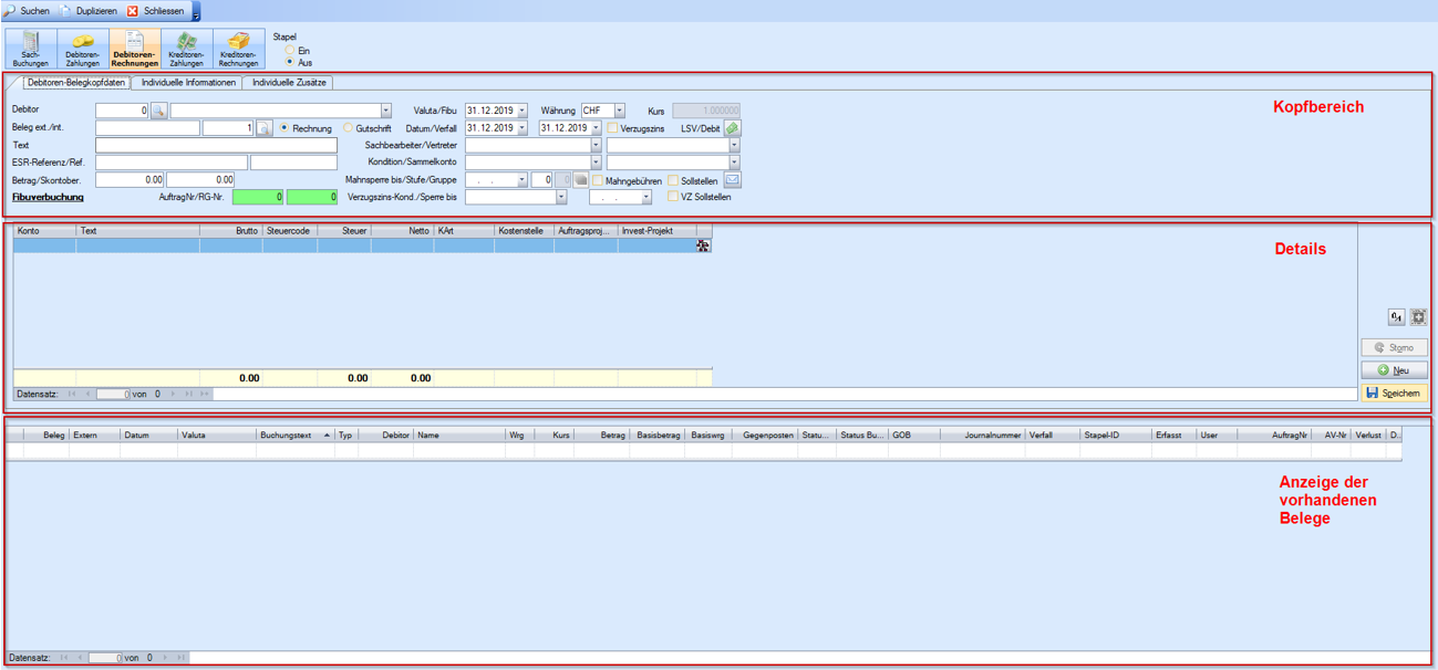 In der Praxis werden Debitoren-Belege (Rechnungen/Gutschriften) meistens integriert über Schnittstellen aus Fakturierungsprogramen verbucht. Deshalb dient die Buchungserfassung Debitoren-Rechnungen oftmals nur zum Abrufen von bereits verbuchten Rechnungen/Gutschriften oder zum Ändern nicht buchungsrelevanter Daten wie zum Beispiel Texte, Beleg- und Verfalldaten, Zahlungskonditionen, Mahninformationen, etc.