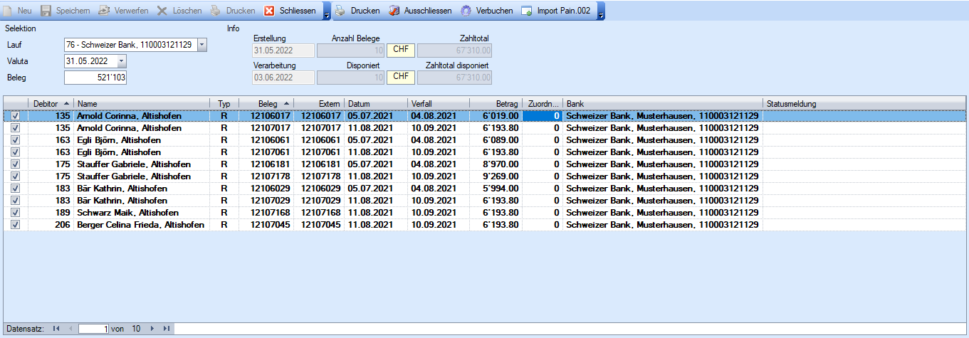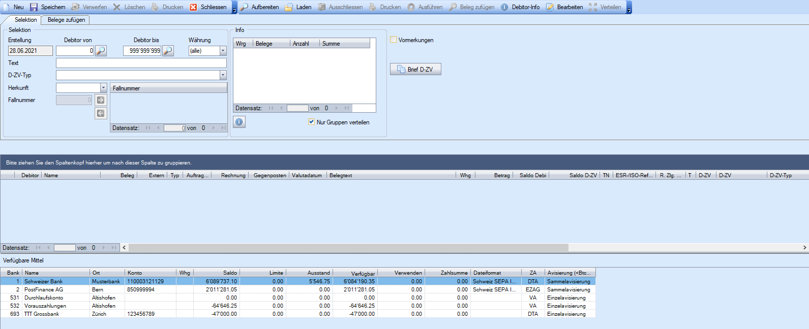 Brief D-ZV | Via Schaltfläche "Brief D-ZV" produziert das System einen Serienbrief für alle Debitoren im Zahllauf, welche noch keine Zahlungsverbindung haben (siehe Gridspalte D-ZV). Ein Explorer-Dialog öffnet sich, über welcher der vorbereitete Microsoft Word-Serienbrief ausgewählt werden muss. | ||||||||||||||||