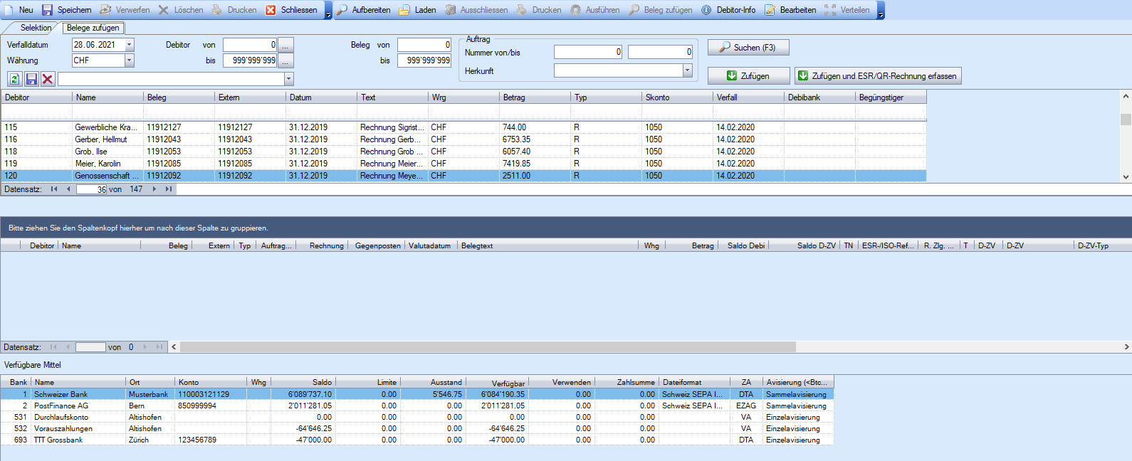 Im Register "Belege zufügen" können Debitorenbelege gemäss den Selektionskriterien, die in der untenstehenden Tabelle beschrieben sind, gesucht und im Debitoren Rückzahlungslauf hinzugefügt werden.
