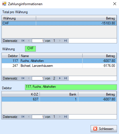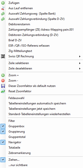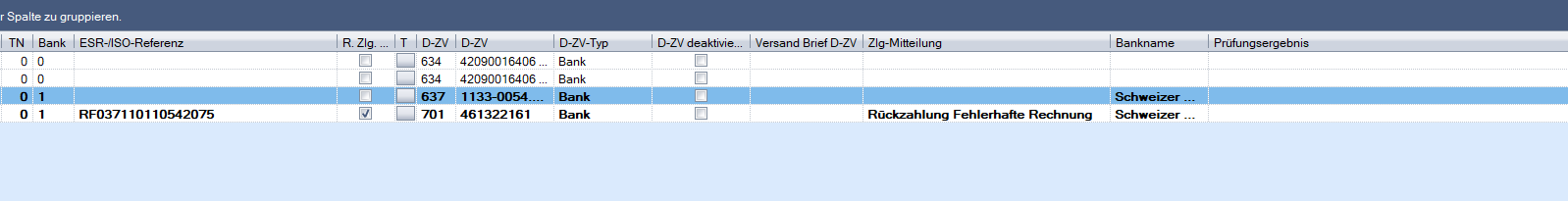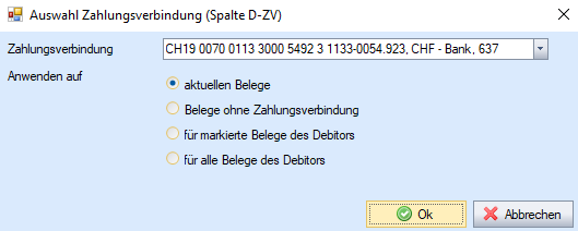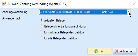 D-ZV (Nummer der Debitoren-Bankverbindung) | Durch Doppelklick auf diese Spalten kann die Debitorenzahlungsverbindung ausgewählt werden.