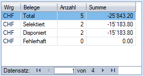 Suchen: Beim Öffnen der Maske gilt die im Hintergrund eingestellte Selektion. verwendet. Der Bereich kann also trotz vorhandenen Belegen durchaus leer sein. Solange wie die Selektion nicht angepasst wird.