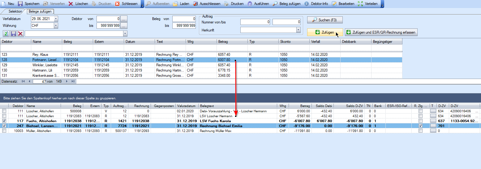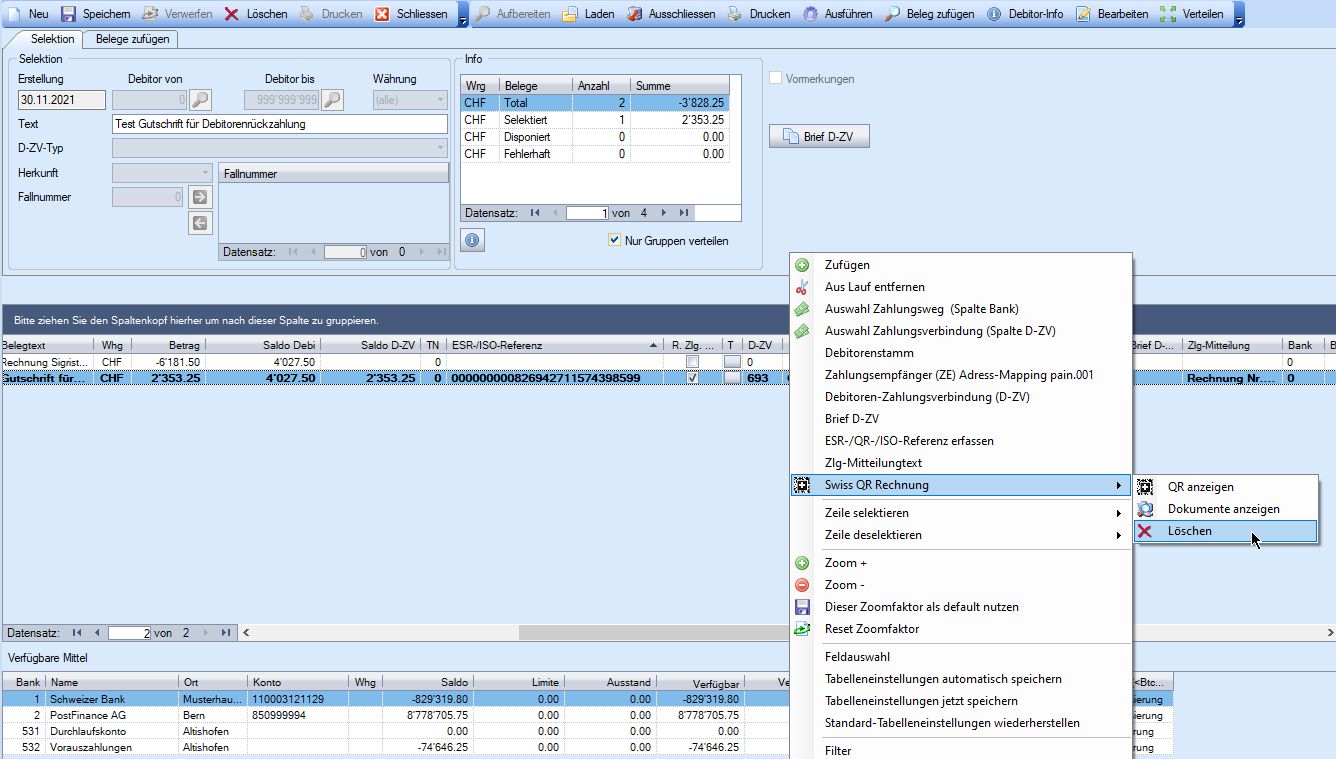 Der markierte Debitorenbeleg im Grid des Registers "Belege zufügen" dem Debitoren Rückzahlungslauf hinzufügen und zusätzlich eine ESR- oder QR-Rechnung für die Rückzahlung erfassen.