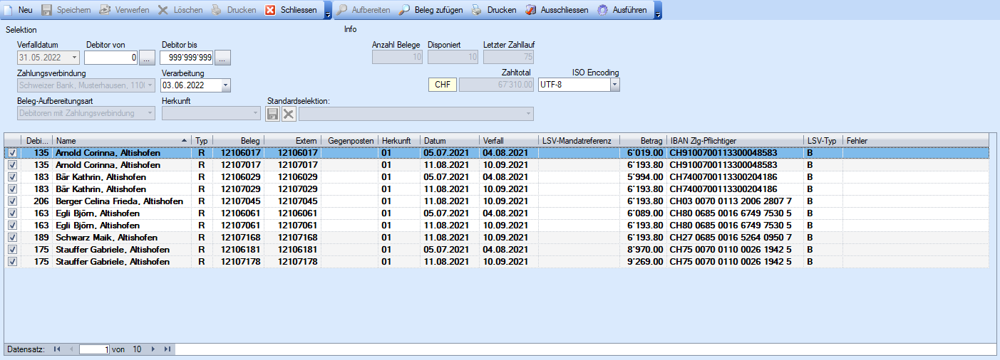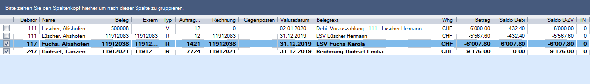 Grid | Auflistung der Debitoren, die gemäss den Angaben in den Selektionsfeldern gefunden wurden |