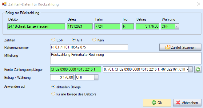 Rückzahlungen können in Voll-, Teil- oder Splitt-Rückzahlung zurückbezahlt werden. Zudem können pro Rückzahlungsposten individuelle Zahlung-Mitteilungstexte und ESR/QR-Referenzen angegeben werden. Für den Fall, dass die Debitor- von der Begünstigten-Adresse abweicht (z.B. Rückzahlung eines OP’s einer Krankenkasse an den Versicherten direkt), können des Weiteren individuelle Begünstigten-Adressen erfasst werden.