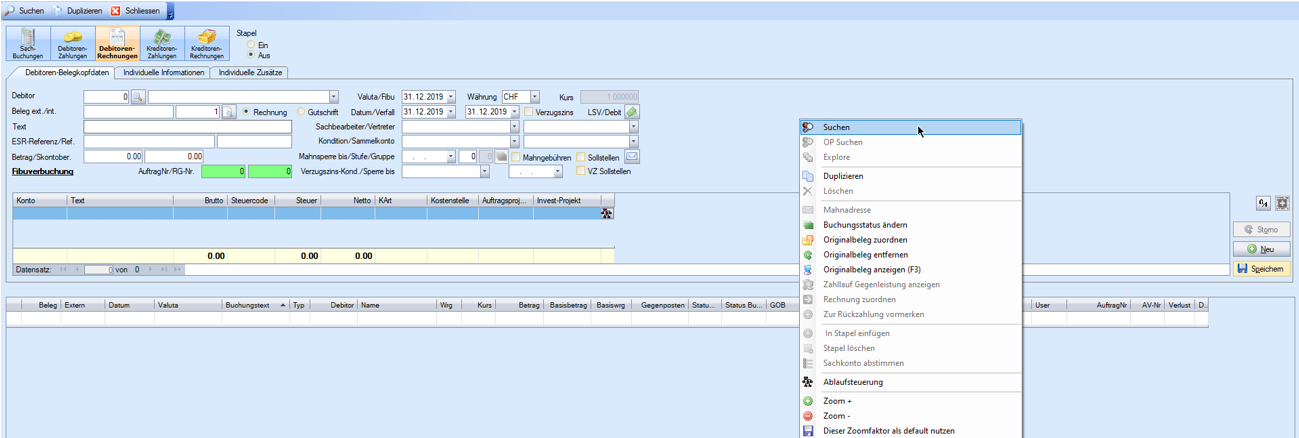 Im Grid der Fibuverbuchung kann über die rechte Maustaste auf ein Kontextmenu verzweigt werden und beinhalten die Funktionen: