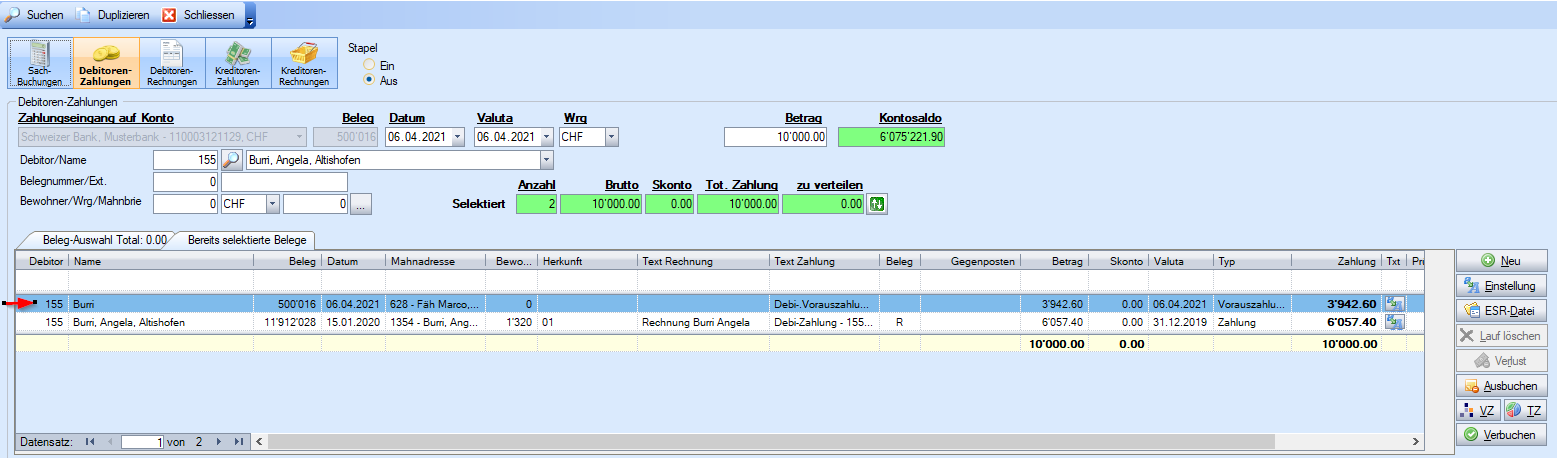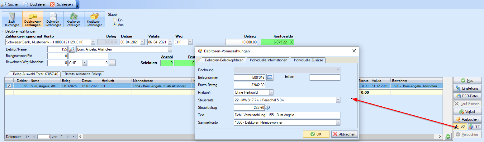 Mit der Funktion [Vorauszahlung] können Vorauszahlungen dieser Art erfasst werden und mittels [Verbuchen] physisch gebucht werden.