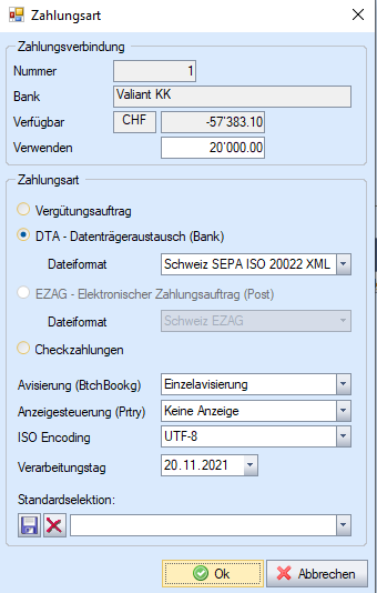 Bank | Durch Doppelklick auf diese Spalte können die eigenen Zahlungsverbindungen disponiert werden. | ||||||||||||||||||||||||||||||||||||