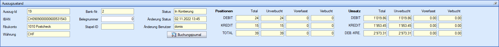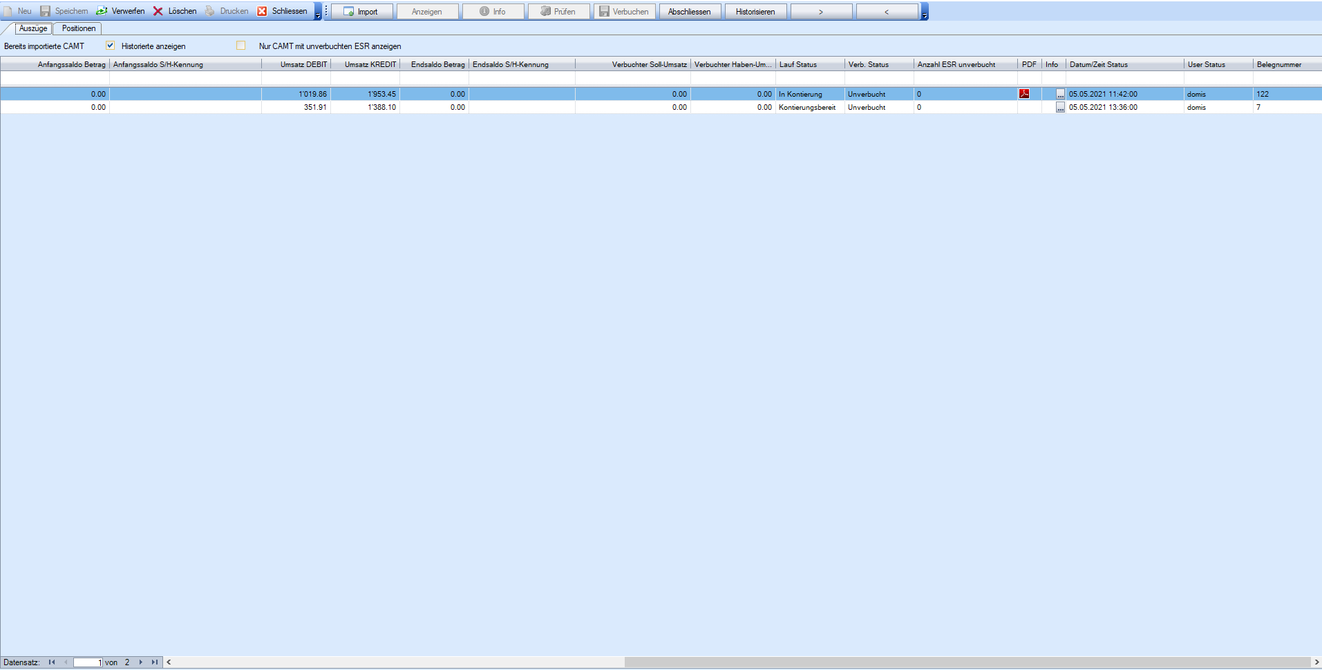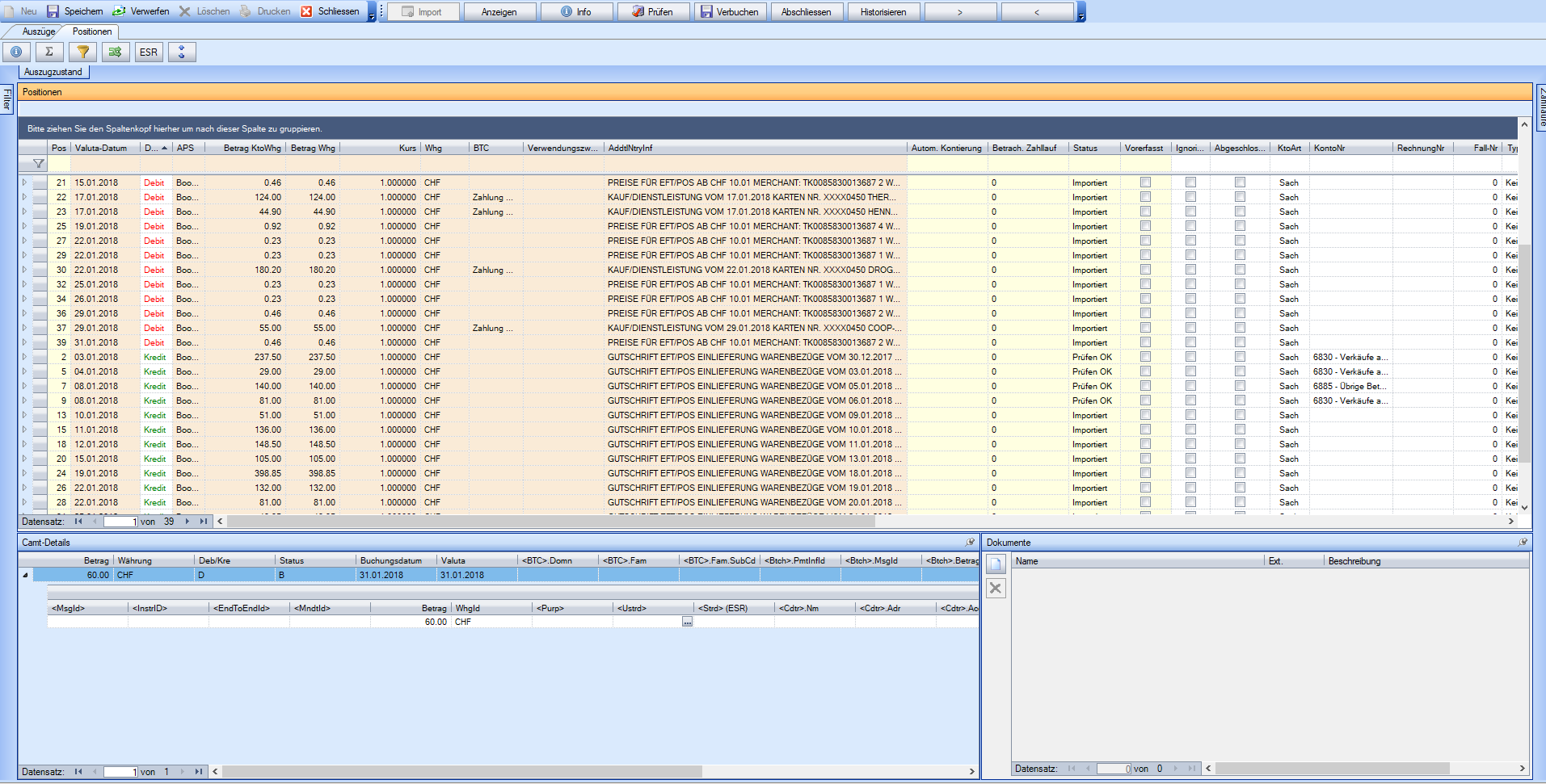 Nach dem Import stehen die Auszug Gutschrift- und Belastungspositionen in einer idealen Übersicht mit Auszugs-, Kontierungs- und Verbuchungsstatus zur weiteren Bearbeitung bereit. Dadurch ist die totale Kontrolle über die Verbuchung der Bankauszugspositionen sichergestellt.