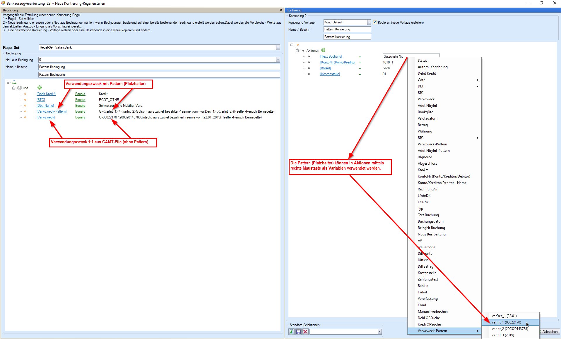 Regel-Sets Kontierung | Im Panel "Regel-Sets Kontierung" werden die definierten Bedingungen mit den entsprechenden Kontierungsvorlagen verknüpft. Beispiel: Wenn eine Bankauszug-Position die Bedingung "AddtINtryInf Text = Kontoführungsgebür" erfüllt, dann kontiere mit der Kontierung-Vorlage "Kontoführungsgebühr" |