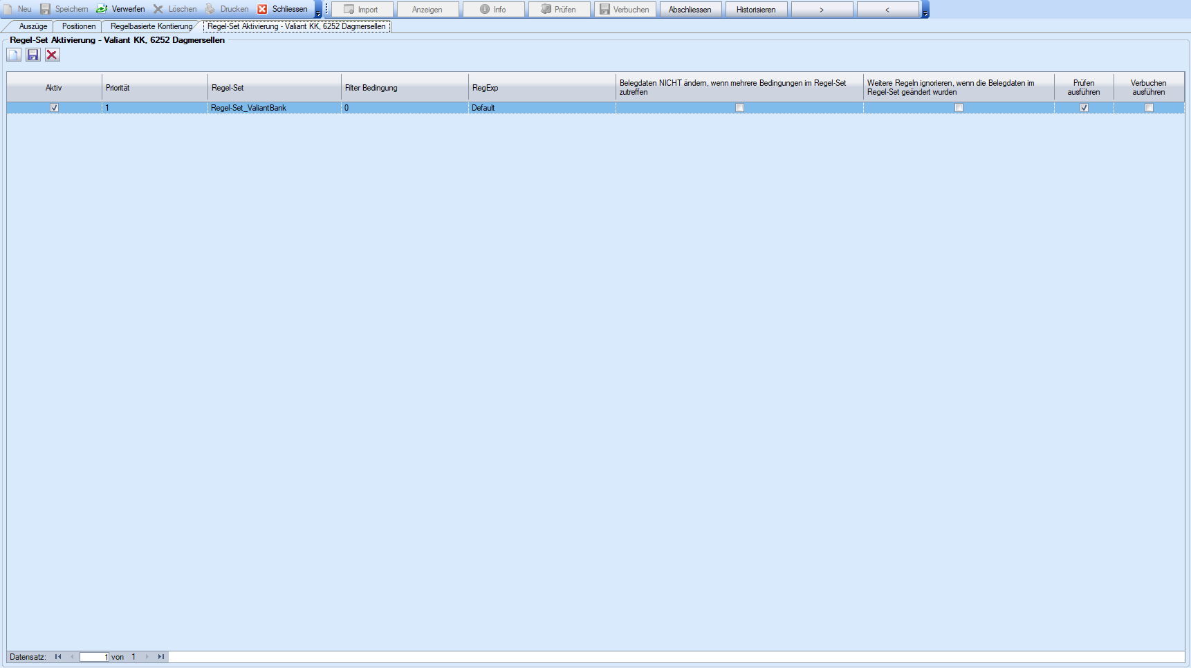 Regel-Set Aktivierung | Im Register "Regel-Set Aktivierung" müssen die Regel-Sets, die im Register "Regelbasierte Kontierung" erfasst wurden, aktiviert werden. Werden die Regel-Sets nicht aktiviert, werden die enthaltenen Regeln für die Kontierung der importierten Bankauszug-Positionen nicht genutzt. |