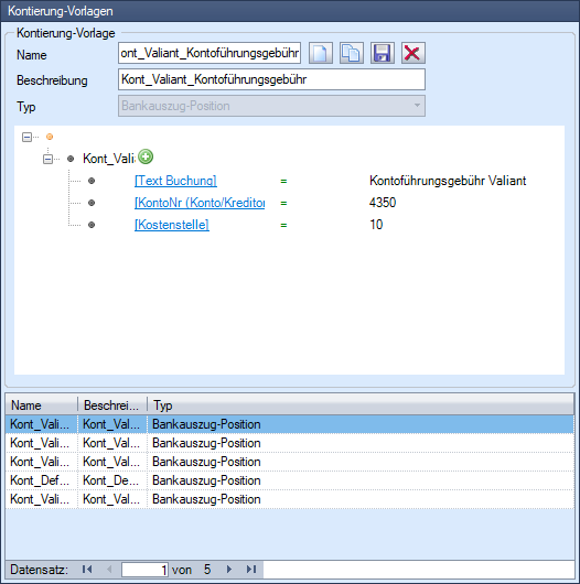 Kontierung-Vorlagen | Im Panel "Kontierung-Vorlagen" können verschiedene Vorlagen für die Kontierung von Bankauszug-Positionen erstellt werden, die bei einer zutreffenden Bedingung auf die Bankauszug-Positionenen angewendet werden. Beispiel: |