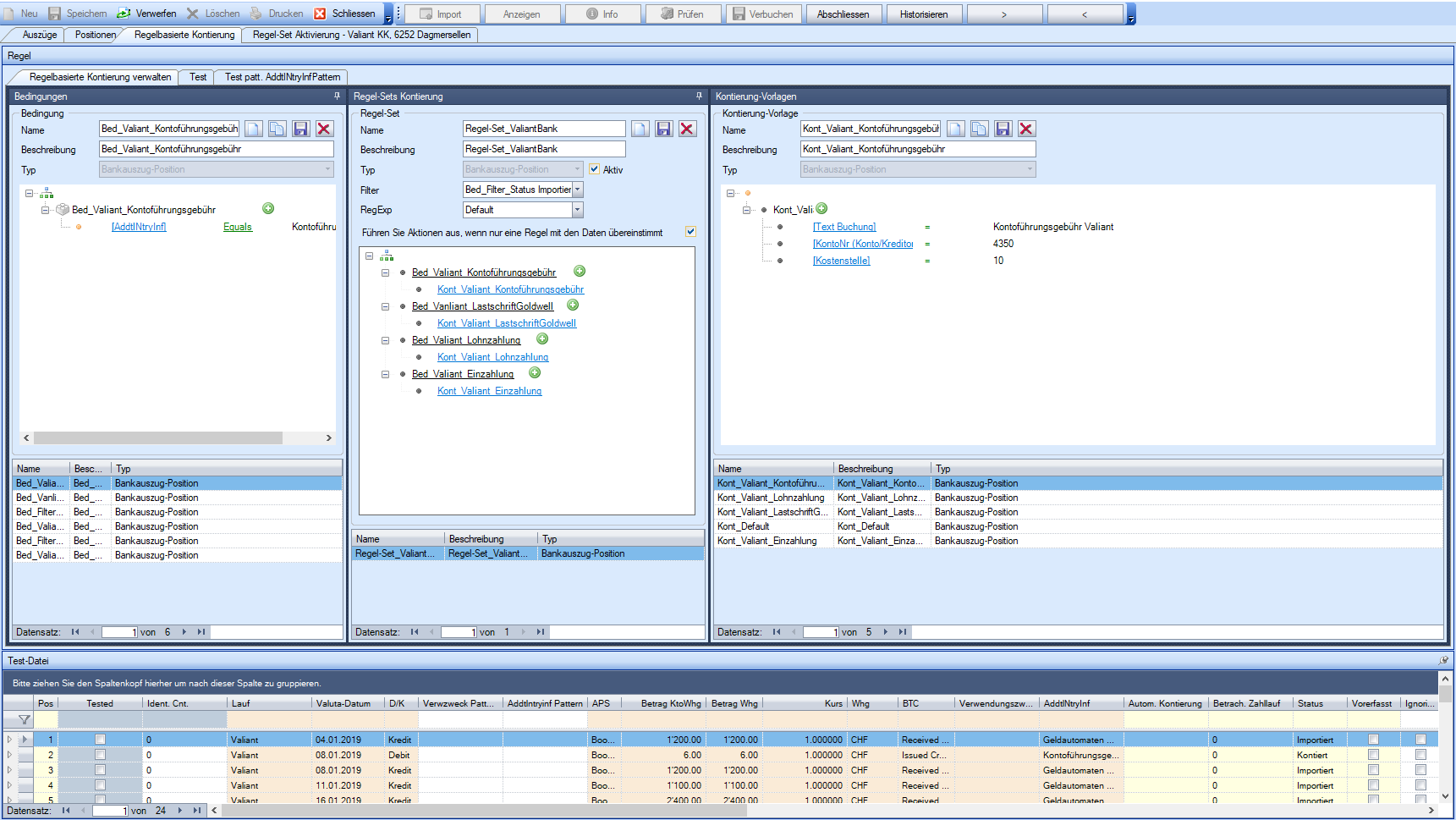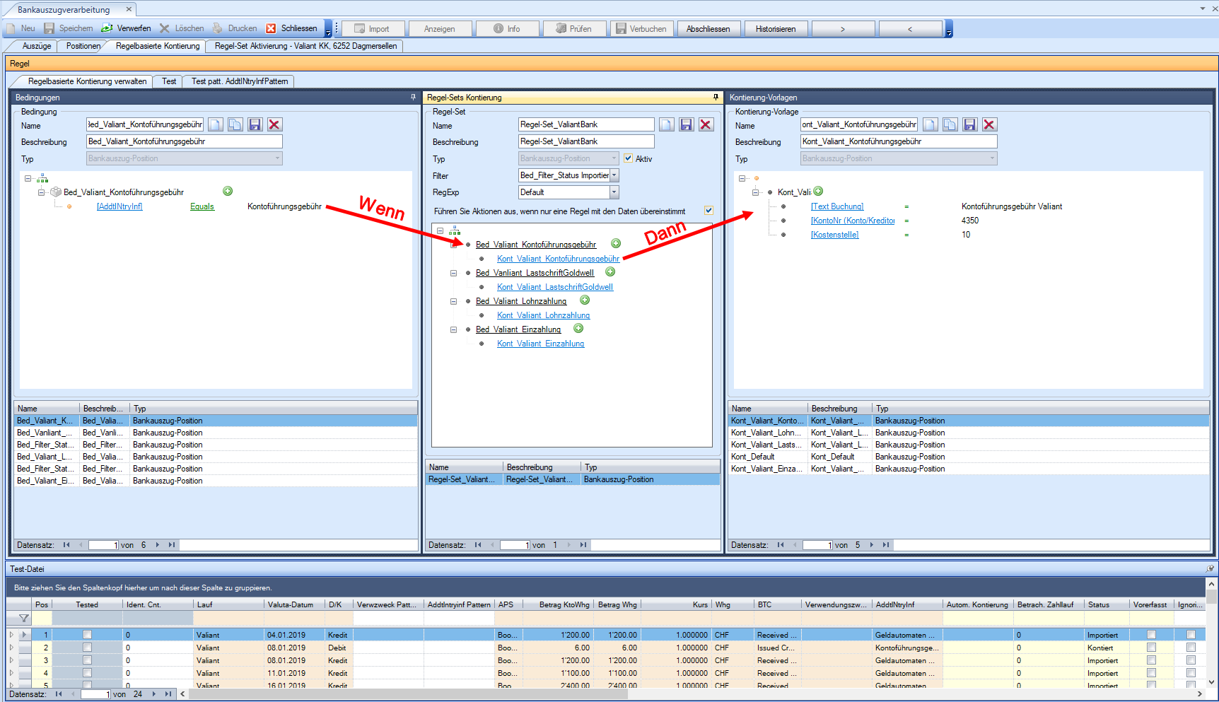 In Regel-Sets werden definierte Bedingungen und Kontierungsvorlagen miteinander verknüpft. Folgend können in der sogenannten „Regel-Set Aktivierung“ die Regel-Sets für die automatische Verbuchung pro Bank freigeschalten werden. Später beim Import werden alle Bankauszug-Positionen auf eine zutreffende Bedingung geprüft und bei Übereinstimmung anhand der dazugehörigen Kontierungsvorlage automatisch kontiert, geprüft und verbucht. Des Weiteren bietet das Kontierungs-Protokoll eine optimale Übersicht von den durchlaufenen Regeln pro Bankauszug-Position.