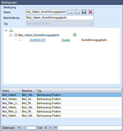 Bedingungen | Im Panel "Bedingungen" können einerseits Filter Bedingungen für die Regel-Set Aktivierung und andererseits diverse Bedingungen für die Regel-Sets definiert werden. Beispiel Filter Bedingung für die Regel-Set Aktivierung: Alle Bankauszug-Positionen mit Status importiert Beispiel Bedingung für das Verknüpfen von Bedingungen und Kontierungsvorlagen zu Regeln im Regel-Set: Alle Bankauszug-Positionen, welche im Panel Positionen in der Spalte AddtINtryInf den Text "Kontoführungsgebür" enthalten. |