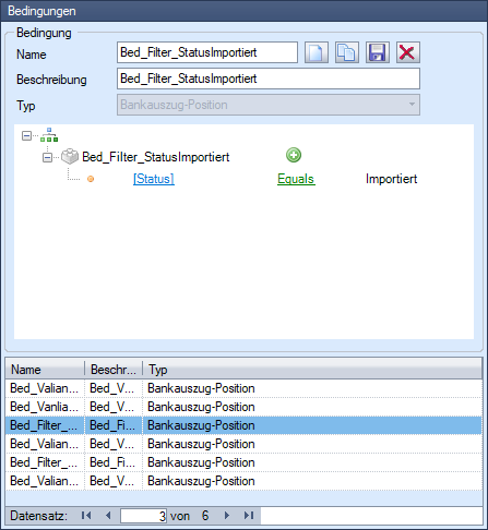 Filter Bedingung | Mit der Filter-Bedingung wird bestimmt, für welche Datensätze (Bankauszug: CAMT-Positionen / Rechnungseingangsbuch: Eingangsrechnungen) das Regel-Set abgearbeitet wird. Für die so gefilterten Datensätze für jede einzelne Bedingungen des Regelsets examiniert und bei Zutreffen die der Bedingung zugewiesene Kontierungsvorlage ausgeführt. Hinweis 2: Filter Bedingungen wie auch Bedingungen für das Regel-Set werden im Panel Bedingungen definiert. |