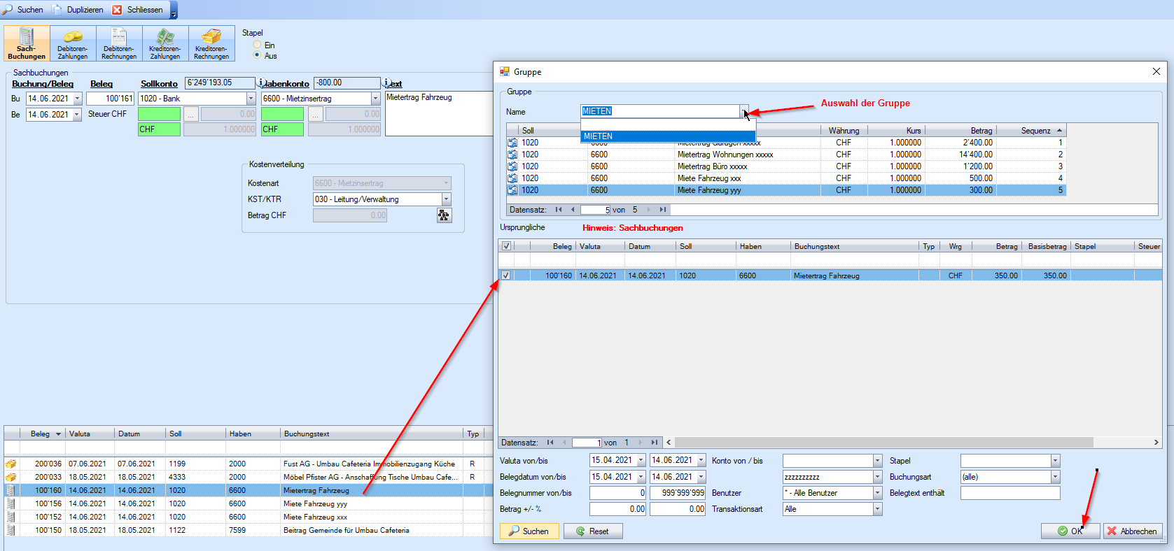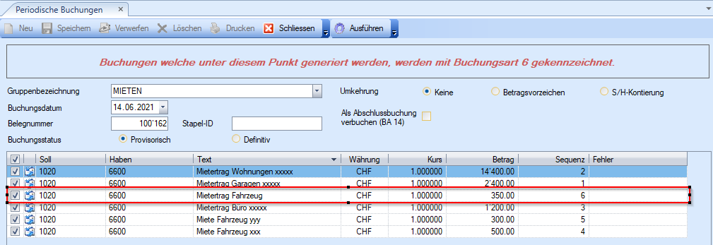 Als Periodische Buchung speichern | Eine oder mehrere markierte Buchung(en) im Grid zu einer bestehenden Gruppe zufügen oder als neue Gruppe von Periodischen Buchungen erfassen. Beispiel-Vorgang für das Zufügen zu einer bestehenden Gruppe: Sachbuchung "Mietertrag Fahrzeug" als eine periodische Buchung speichern: Ansicht in der Maske "Periodische Buchungen" nachdem die Sachbuchung "Mietertrag Fahrzeug" über das Fenster "Gruppe" als eine periodische Buchung gespeichert wurde: Hinweis: Beim Vorgang Erfassen als neue Gruppe, einfach im Feld Gruppenbezeichnung einen neuen Gruppennamen eingeben und [OK] drücken. ACHTUNG: Die Gruppenbezeichnung kann maximal 15 Zeichen alphanumerisch enthalten. Wird eine Gruppenbezeichnung mit mehr als 15 Zeichen angegeben, wird die Gruppe nicht gespeichert. |