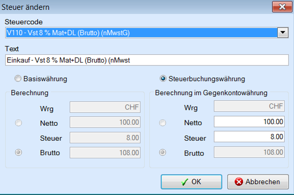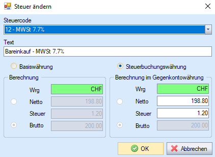 Steuer | Bei steuerpflichtigen Buchungen: Angabe zur Mehrwertsteuer der Buchung auf der Soll- oder Habenseite. Im Feld Steuercode (im Beispiel V110) wird der Steuercode vorgeschlagen, welcher aufgrund des gewählten Sachkontos im Kontostamm zugeordnet wurde. Der Steuerbetrag wird gemäss Stammdaten/Steuersätze berechnet und kann vom Benutzer direkt überschrieben werden. Soll der Steuercode geändert werden, kann über die Schaltfläche […] oder die rechte Maustaste auf dem Steuerbetragsfeld der Steuercode ändern gewählt werden: Im Steuer ändern Dialog kann der Steuercode und der Steuerbuchungstext geändert werden. Der Steuerbetrag kann entweder in Basiswährung (=Währung des Mandanten) oder aber in der Steuerbuchungswährung bestimmt werden. Die Steuerbuchungswährung wird über die Währung des Gegenkontos bestimmt, welches dem Steuercode (siehe Stammdaten/Steuersätze) zugeordnet wurde. Dies ist zum Beispiel dann relevant, wenn es sich im einen Schweizer Mandanten mit Basiswährung CHF handelt und gewisse Umsätze bzw. die Steuer in einem EU-Land in EUR abgerechnet werden muss. | ||||||||||||||||