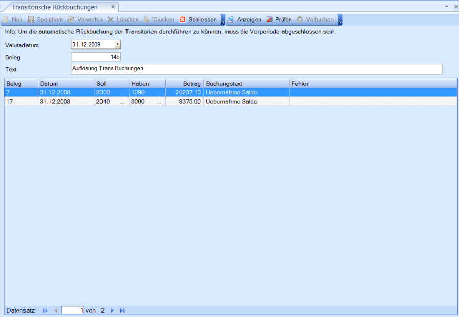 [Anzeigen] | Zeigt die aufzulösenden Transitorischen Buchungen der Vorperiode im Grid an. |