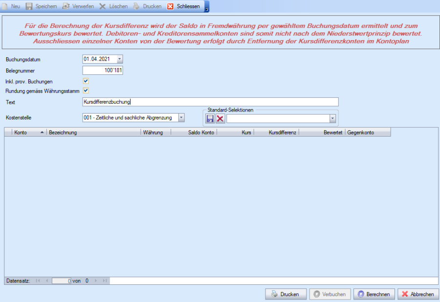 Valutadatum | Datum (Zinsabschluss), per welches der Zins aller Zinskonten berechnet werden soll. Beim [Verbuchen] der berechneten Zinsbuchungen wird dieses Datum zudem als Buchungsdatum (Valuta Periodenzuordnung) verwendet. |