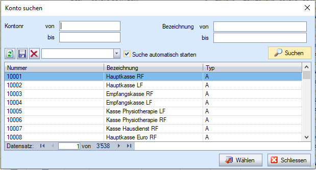 [Suchen] | Blendet ein Fenster mit den Suchkriterien ein, um Buchungen in das Buchungsgrid zu laden. Hinweis: Dieselbe Funktion kann auch direkt mit der Funktionstaste F12 oder über das Rechte-Maustaste-Kontextmenu des Buchungsgrid aufgerufen werden.