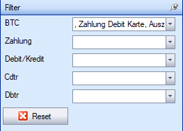 Einblenden des Panels Filter. Selbe Funktion wie die Schaltfläche Anzeigen in der Toolbar. (siehe Toolbar-Beschreibung Anzeigen → Filter) | |||||||||||||||||||||||||||||||||||||