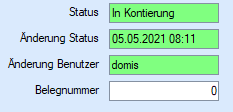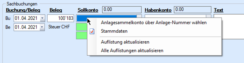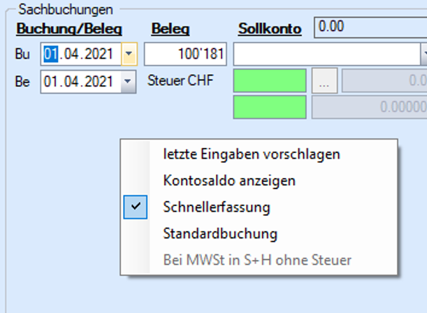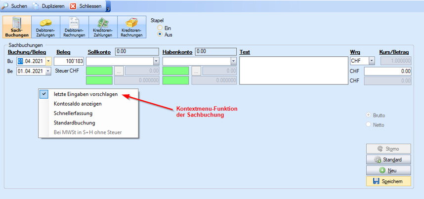 Sachbuchungen | Im Bereich Sachbuchungen werden die Kontierungen und Verbuchungsdetails der Sachbuchung erfasst/bearbeitet. Kontextmenu-Funktionen „Letze Eingabe vorschlagen“ Bei eingeschalteter Kontextmenu-Funktion „letzte Eingabe vorschlagen“ (Erreichbar über Rechte-Maustaste ausserhalb eines Feldes des Bereiches Sachbuchung) bleiben beim Speichern einer Sachbuchung die Feldwerte der Buchung für die nächste Buchung stehen. Diese Einstellung gilt für den angemeldeten Benutzer. | ||||||||||||||||