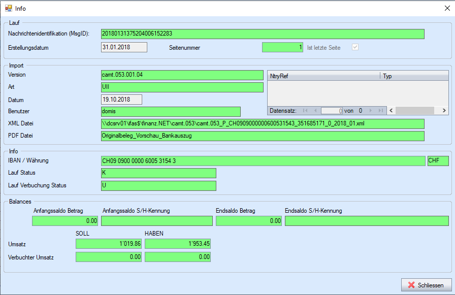 [Info] | Aktiv im Register Positionen: Ein Fenster "Info" öffnet sich mit diversen Informationen zur importierten CAMT-Datei: Mit dem Button [Schliessen] kann man das Fenster "Info" wieder verlassen. | ||||||||||||||||||||||