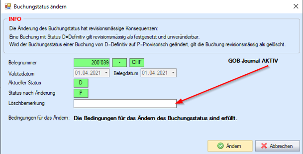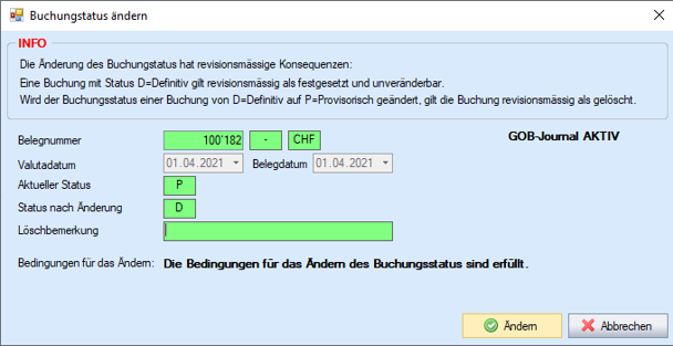 Buchungsstatus ändern | Öffnet einen Dialog zum Ändern des Buchungsstatus. Der Buchungsstatus einer Buchung lässt sich über diese Funktion bei Bedarf ändern. Allerdings müssen revisionsmässige Bedingungen erfüllt sein, welche vom Programm automatisch geprüft und angezeigt werden. Das Ändern des Status von P(rovisorisch) auf D(efinitiv) ist praktisch immer möglich. Hingegen ist das Ändern einer revisionsmässig festgesetzten Buchung von D auf P strengen Regeln unterworfen. Lässt das Prüfergebnis die Änderung zu, kann der Status auf P geändert werden. Die Buchung gilt danach revisionsmässig als gelöscht und wird deshalb auch in das sogenannt GOB-Journal unter Angabe einer Löschbemerkung protokolliert. Wichtiger Hinweis: Das Protokollieren von Buchungen ins GOB-Journal muss in den Einstellungen/Finanzbuchhaltung aktiviert sein, damit der Buchungsstatus änderbar ist. Status ändern P => D: Status ändern D => P: |