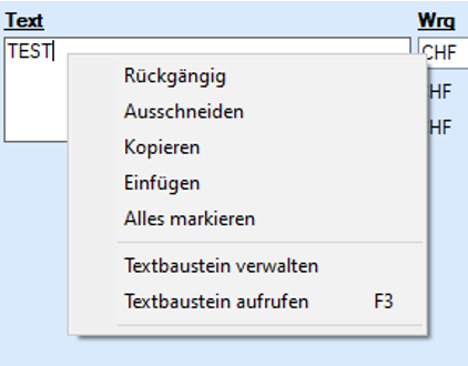 Text | Buchungstext (50 Stellen alphanumerisch) Die Eingabe eines Buchungstextes ist aus revisionsgründen zu jeder Buchung erforderlich. Arbeiten mit Textbausteinen Über sogenannte Textbausteine lässt sich die Eingabe des Buchungstextes effizienter gestalten (siehe Kontextmenu-Funktionen). Der Textbaustein-Kürzel kann im Feld Buchungstext eingegeben werden und mittels F3 wird der zutreffende Buchungstext aus den Textbausteinen automatisch vom Programm eingesetzt. Achtung: Gross-/Kleinschreibung wird beim Kürzel unterschieden! Wird der Textbaustein-Kürzel nicht gefunden, erscheint das Fenster mit der Textbausteinverwaltung. Kontextmenu-Funktionen (Rechte Maustaste)