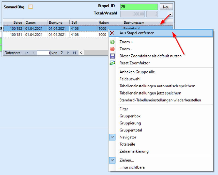 Mit der Pfeil-Schaltfläche kann der Bereich Stapel um ein Grid erweitert werden, welcher alle im Stapel enthaltenen Buchungen anzeigt. Über dessen Kontextmenu lassen sich Buchungen aus dem Stapel wieder entfernen. Entfernte Buchungen bleiben als Buchung ohne Stapelzugehörigkeit bestehen. | |||||||||||||||||