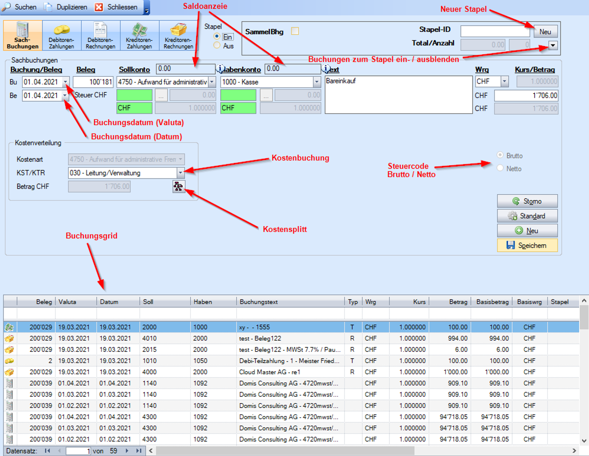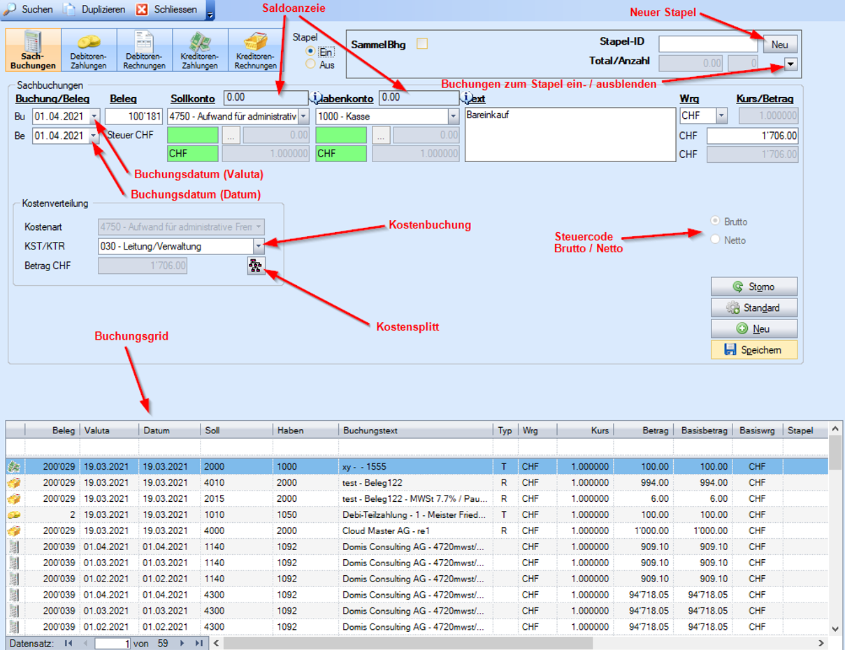 Buchungserfassung Sachbuchungen – Grid Buchungen